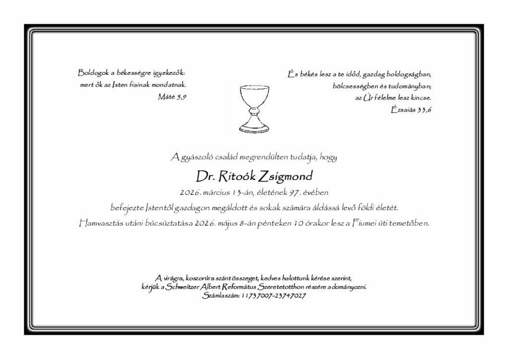 Ritoók Zsigmond ókortudós és klasszika-filológus, a Magyar Tudományos Akadémia rendes tagja, a Magyar Református Presbiteri Szövetség egykori elnöke 2026. március 13-án, életének 97. évében hunyt el. A gyászoló család tájékoztatása szerint hamvasztás utáni búcsúztatása 2026. május 8-án, pénteken 10 órakor lesz a Fiumei úti temetőben.